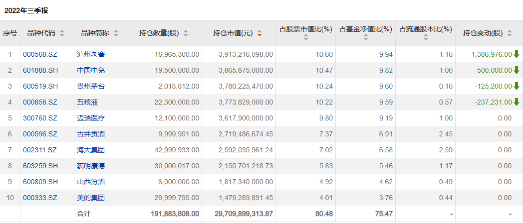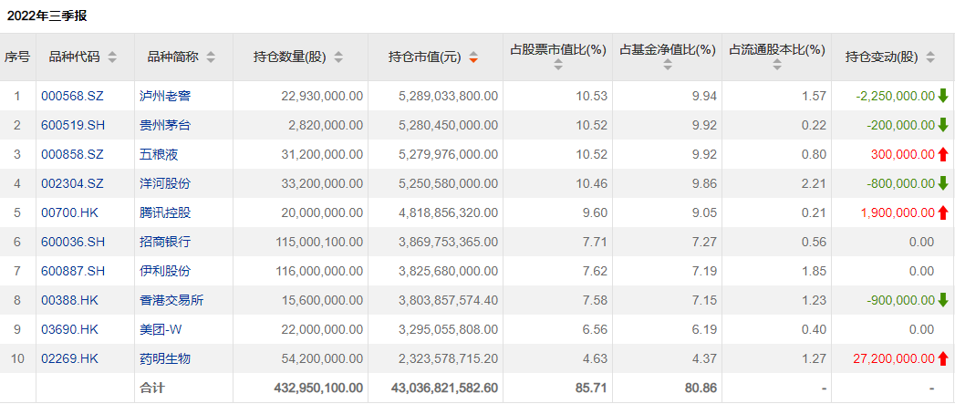 易方达蓝筹精选三季度末重仓持有泸州老窖、贵州茅台、五粮液、洋河股份四只白酒股。此外,腾讯控股、招商银行、伊利股份、香港交易所、美团-W、药明生物也位居该基金前十大重仓股。