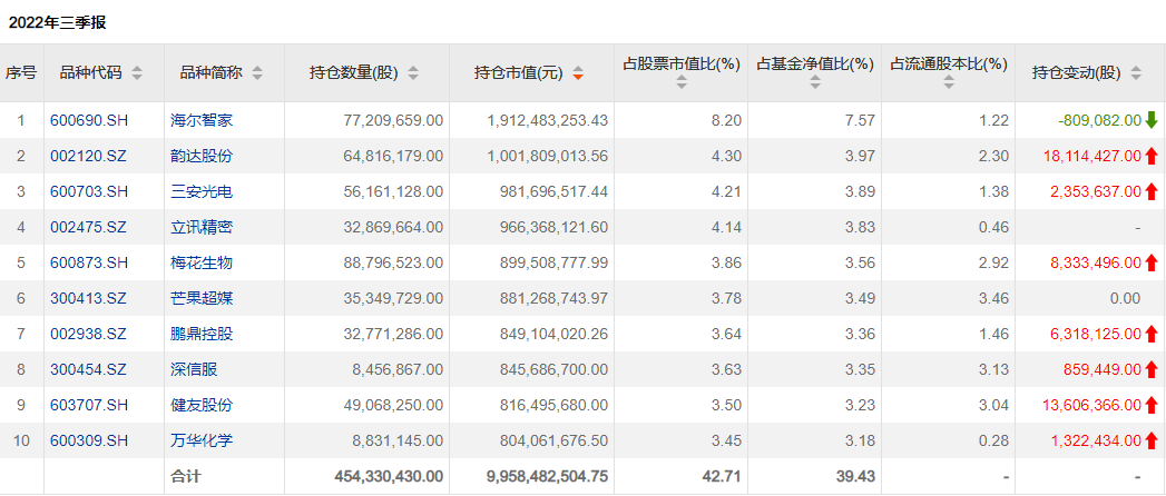 三季度末,兴全合润混合高仓位运行,股票仓位达到91.9%,重仓持有海尔智家、韵达股份、三安光电、立讯精密、梅花生物、芒果超媒、鹏鼎控股、深信服、健友股份、万华化学。