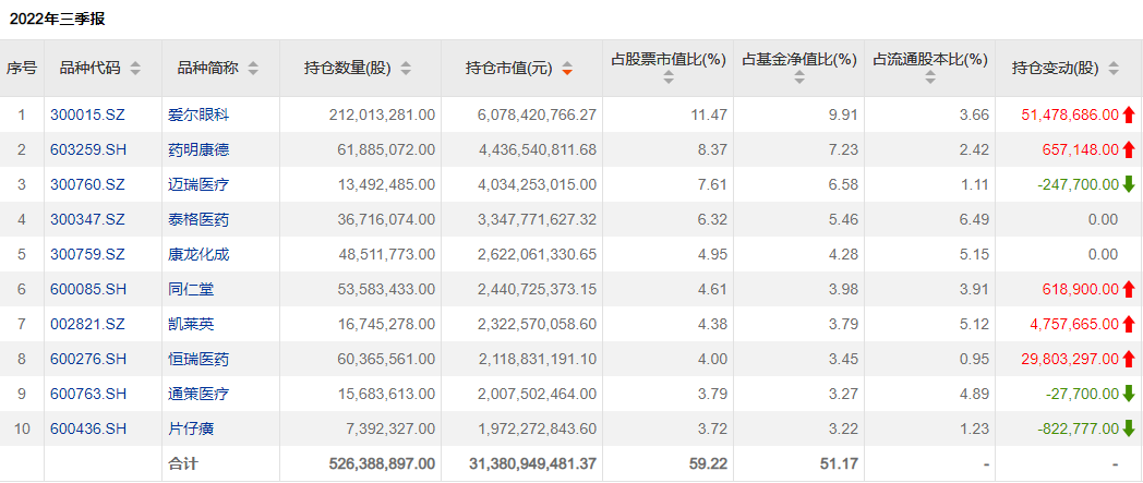三季度,中欧医疗健康大幅加仓爱尔眼科5147.87万股,加仓恒瑞医药2980.33万股,使其进入前十大重仓股行列。此外,中欧医疗健康在三季度还加仓了凯莱英、药明康德、同仁堂。