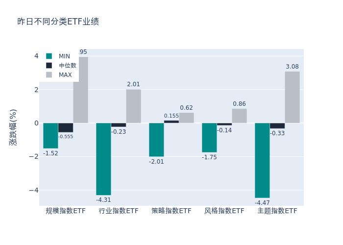 昨日股票型ETF收益率中位数为-0.41%。其中按照不同分类,规模指数中中药ETF收益率最高,为3.95%;行业指数中招商中证全指软件ETF收益率最高,为2.01%;策略指数中华夏中证红利质量ETF收益率最高,为0.62%;风格指数中嘉实新兴科技100ETF收益率最高,为0.86%;主题指数中华夏中证云计算与大数据主题ETF收益率最高,为3.08%。