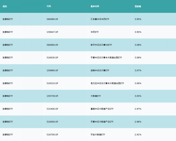 昨日股票型ETF涨幅最高的3支ETF及其收益率分别为:汇添富中证中药ETF(3.95%)、中药ETF(3.95%)、新华中证云计算50ETF(3.08%)。涨幅前10详情见下表: