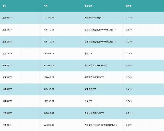 昨日股票型ETF跌幅最大的3支ETF及其收益率分别为:建信中证饮料主题ETF(-4.31%)、华夏中证细分食品饮料产业主题ETF(-3.82%)、华宝中证细分食品饮料产业主题ETF(-3.78%)。跌幅前10详情见下表: