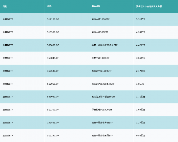 昨日股票型ETF资金流入最多的3支ETF及其流入金额分别为:南方中证1000ETF(流入5.31亿元)、南方中证500ETF(流入4.99亿元)、华夏上证科创板50成份ETF(流入4.42亿元)。资金流入前10详情见下表: