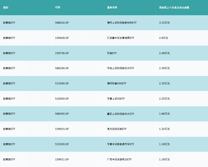 昨日股票型ETF资金流出最多的3支ETF及其流入金额分别为:博时上证科创板新材料ETF(流出3.15亿元)、汇添富中证主要消费ETF(流出2.6亿元)、饮食ETF(流出2.48亿元)。资金流出前10详情见下表: