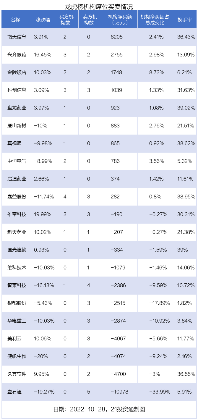 10月28日,21只个股龙虎榜出现了机构的身影,机构合计净卖出1.75亿元。具体来看,机构净买入10股,净卖出11股。