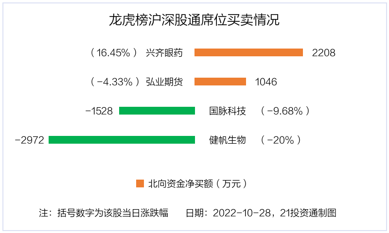 北向资金净买入金额最多的是兴齐眼药(300573.SZ),净买入2208万元,占总成交金额的2.39%。净卖出金额最多的是健帆生物(300529.SZ),为2971.59万元,占总成交金额的6.74%,当日收盘下跌20%,换手率为2.16%。