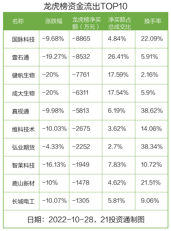 而龙虎榜中资金净流出最多的是国脉科技(002093.SZ),被净卖出为0.89亿元,占总成交金额的4.84%。国脉科技收盘下跌9.68%,换手率为22.09%。