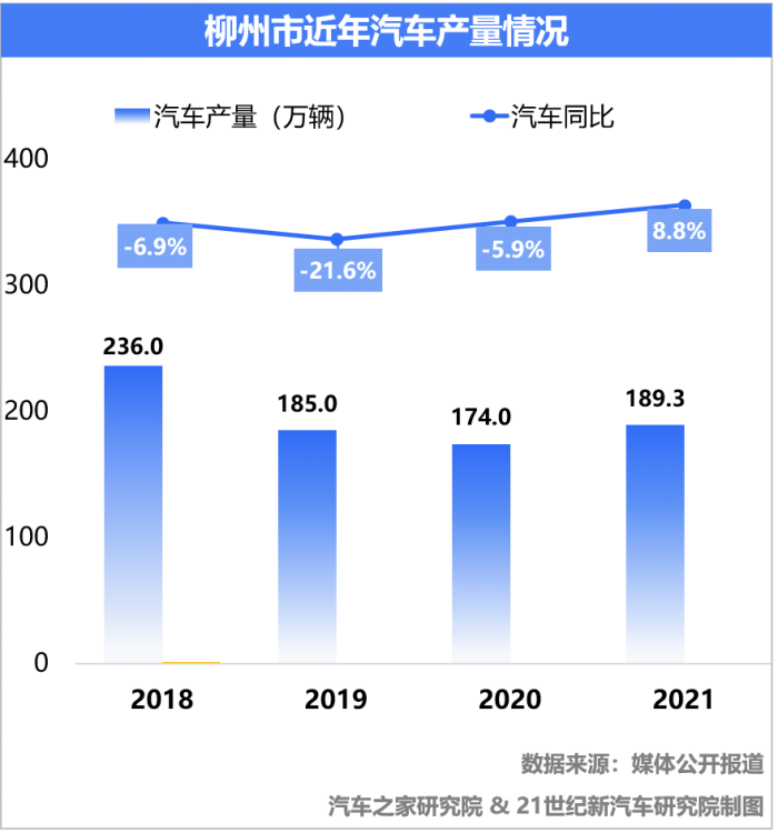 与之相应的是,柳州汽车产量在2017年253万辆的顶峰后,开始下滑,2020下滑至170万辆,即便从2021年止跌回升,2021年的汽车产量,也较2017年的高峰少了近60万辆。