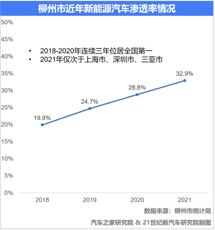完善的充电网络,极大促进了当地新能源汽车市场的发展。2018年-2021年,柳州市新能源汽车渗透率为19.9%、24.7%、28.8%、32.9%,2018-2020年连续三年位居全国第一,2021年仅次于上海市、深圳市、三亚市。