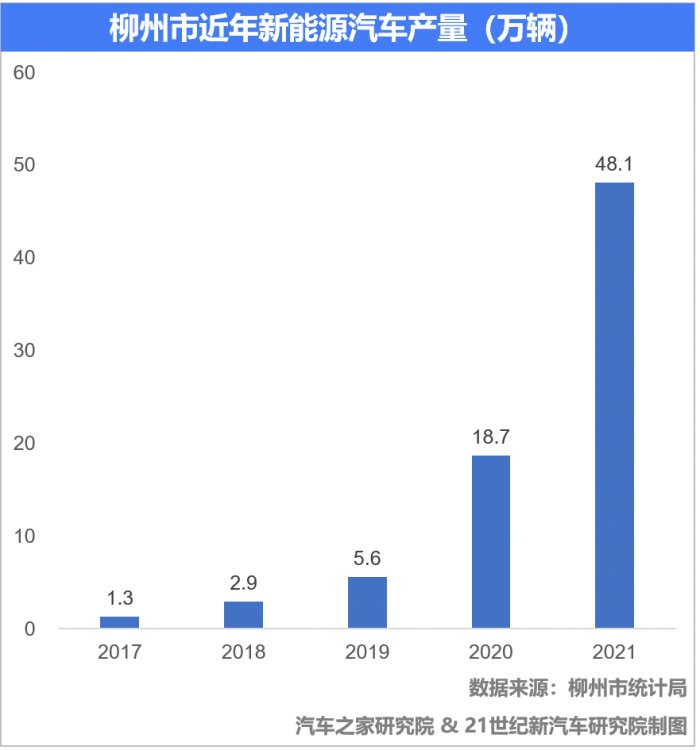 凭借在家门口市场积累的成功经验,五菱自2020年推出宏光MINIEV后,开始在新能源汽车领域大爆发。在其带动下,柳州市的新能源汽车产量也明显跃升,来自柳州市统计局的数据显示,2017年-2021年,柳州的新能源汽车产量分别为1.3万辆、2.9万辆、5.6万辆、18.7万辆、48.1万辆。