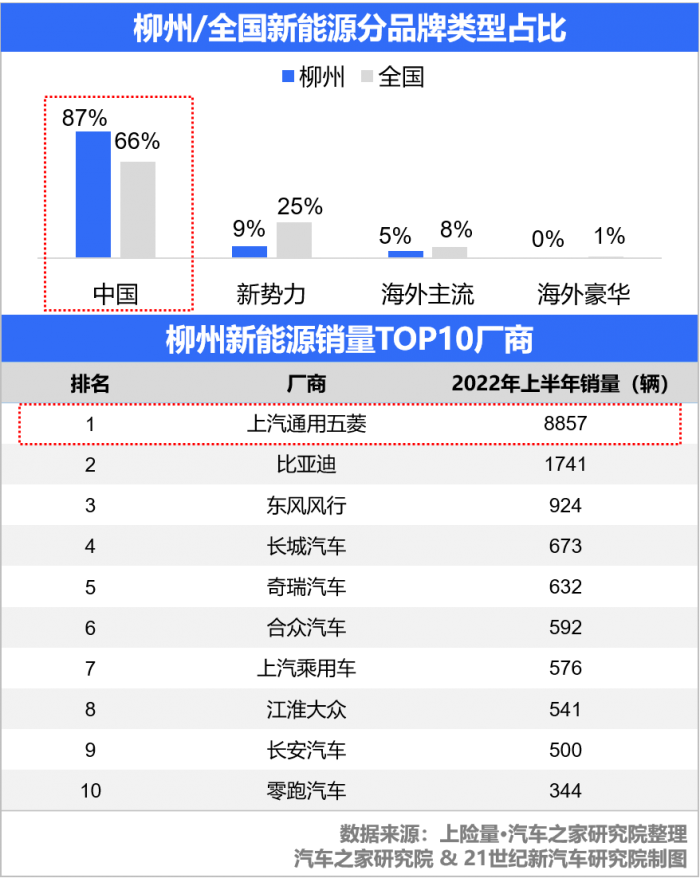 在新能源汽车消费特点上,柳州市新能源销售品牌以中国品牌为主,占比达87%,高于全国水平(66%)。从厂商销量排名来看,本地企业上汽通用五菱厂商在柳州一家独大,上半年销量破5千的厂商仅有上汽通用五菱,其他销量均不足5千台。