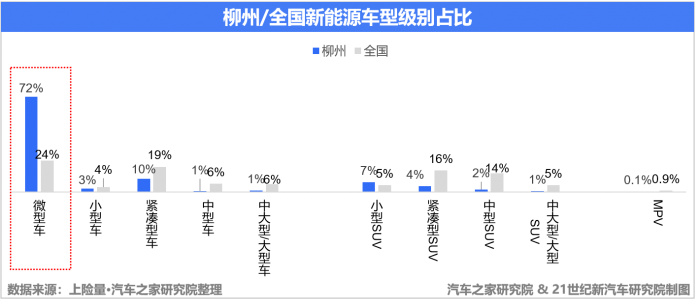 从车型来看,柳州新能源用户更偏好微型车,微型车消费占比高达71.7%,远高于全国平均水平(23.5%);但对于其他更高级别的车型,柳州新能源用户的产品偏好均低于全国。