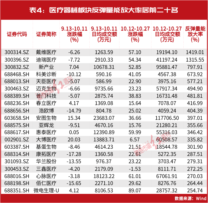 医疗器械板块中量能放大率超过1倍的个股多达65只,表4列出了前20名,前三名是戴维医疗、迪瑞医疗、新产业。