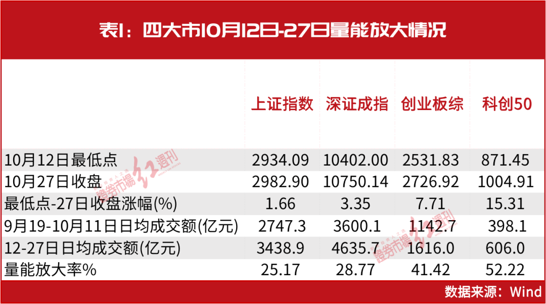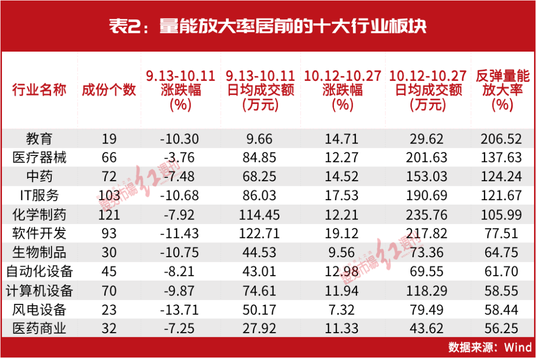 成交放量最多的是教育板块,有19只成份股,在9月13日-10月11日的日均成交额为9.66亿元,10月12日-27日的日均成交29.62亿元,放大率高达206%,整体反弹幅度达14.71%,居A股前列。排名第二的医疗器械行业有66只成份股,9月13日-10月11日的日均成交额为84.85亿元,10月12日-27日的日均成交201.63亿元,放大率达138%,反弹幅度12.27%,是机构资金最主要的进攻目标。