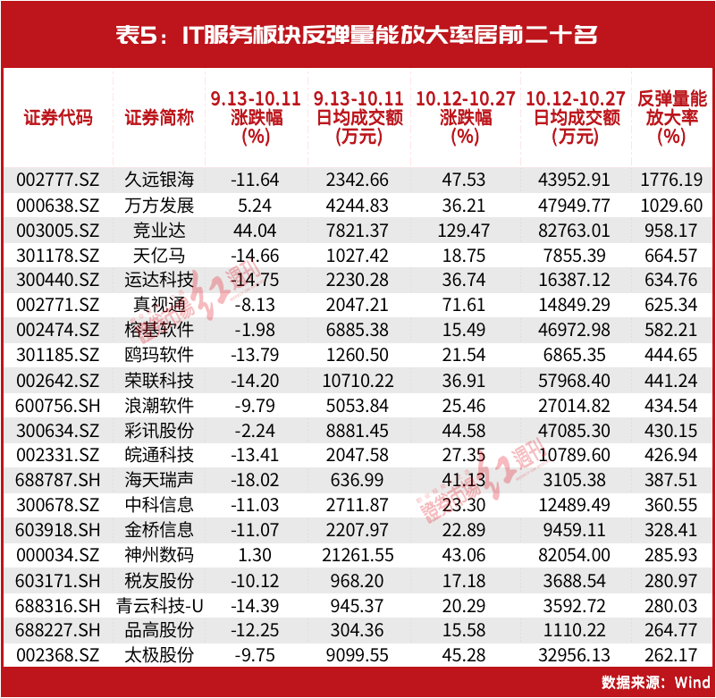IT服务板块中量能放大率超过1倍的个股有43只,表5列出了前20名,前三名是久远银海、万方发展、竞业达。