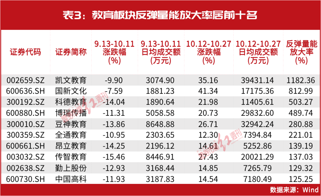 具体到教育板块,量能放大率超过1倍的个股有10只(如表3),居前的是凯文教育、国新文化、科德教育。
