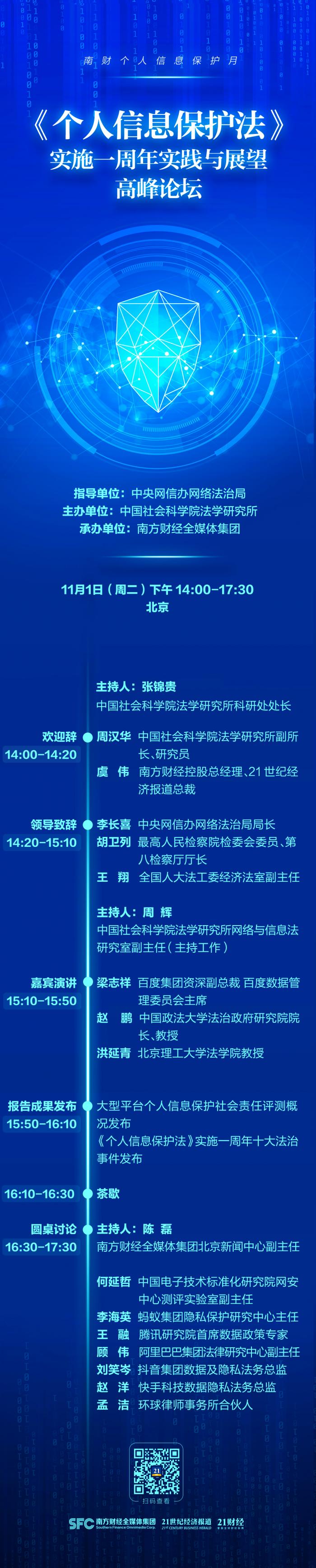 今天(11月1日)是《个人信息保护法》实施一周年,南方财经全媒体集团宣布发起“个人信息保护月”大型活动。由中央网信办网络法治局指导、中国社科院法学所主办、南财全媒体集团承办的“《个人信息保护法》实施一周年实践与展望”高峰论坛在京举办。
