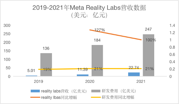 以较早布局的Meta为例,Meta在2019年就上线了第一代Quest,而根据其2019-2021年报可以看到,reality labs(包括了Quest之内的硬件设备)三年营收分别为5.01亿、11.39亿和22.74亿美元。在2021年,同比增幅为100%,已经比2020年同比127%的增幅有所下滑。