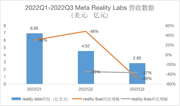 2022年前三季度,Meta reality labs分别实现6.95亿、4.52亿和2.85亿美元营收,同比增幅30%、48%和-49%。并且,在第三季度出现了环比、同比双降的局面。