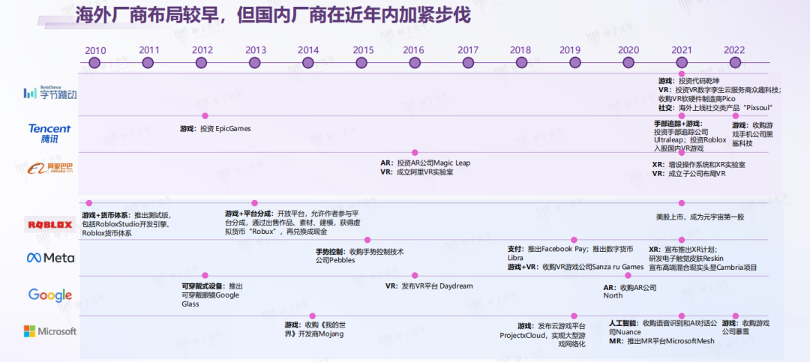 比如,有“元宇宙第一股”称号的游戏平台Roblox,在2010年就开始推出其Roblox Studio开发引擎和自己的货币体系、Microsoft则早在2013年收购了游戏《我的世界》的开发商Mojang。