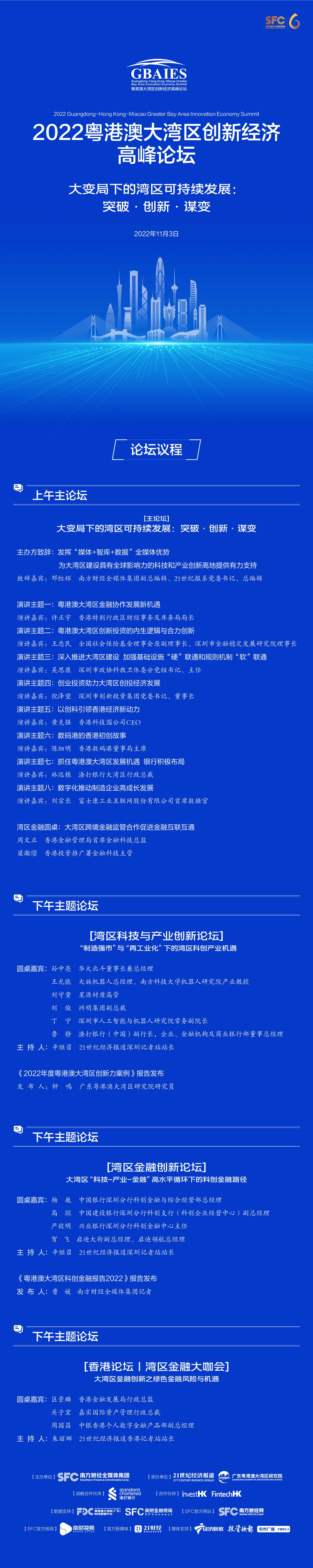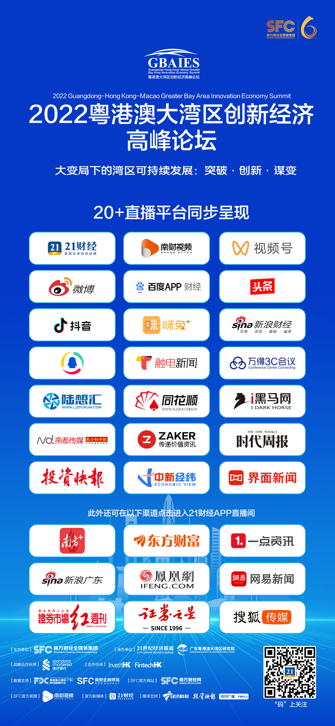 记者获悉,由南方财经全媒体集团主办,21世纪经济报道、广东粤港澳大湾区研究院承办的“2022粤港澳大湾区创新经济高峰论坛”将于11月3日在深圳、香港两地以“线上+线下”方式举行。