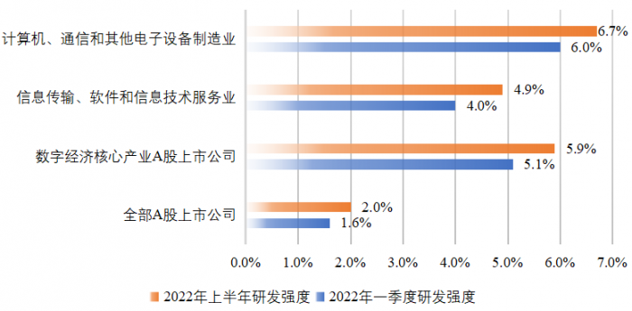 一是数字经济核心产业研发强度持续较快增长。今年上半年,数字经济核心产业A股上市公司研发强度(研发支出/营业总收入)为5.9%,比全部A股上市公司高出3.9个百分点,较一季度提高0.8个百分点,提高幅度比全部A股上市公司高出0.4个百分点。