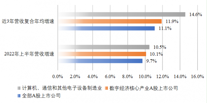 二是数字经济核心产业营业总收入实现较快增长。营业收入较快增长是行业快速成长的重要标志。今年上半年,数字经济核心产业A股上市公司营业总收入同比增长10.1%,增幅较全部A股上市公司高出0.4个百分点。近三年数字经济核心产业A股上市公司营收年均复合增长率高达11.9%,较全国A股上市公司高出0.8个百分点。