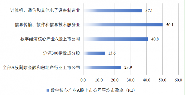 三是数字经济核心产业得到资本市场相对较高的估值。数字经济代表了未来发展方向,成长空间大,市场给予了较高估值。今年6月末,数字经济核心产业A股上市公司平均市盈率(PE)为40.8,是同期沪深300指数成分股平均市盈率的3.0倍,是全部A股中剔除金融和房地产行业上市公司平均市盈率的1.7倍。