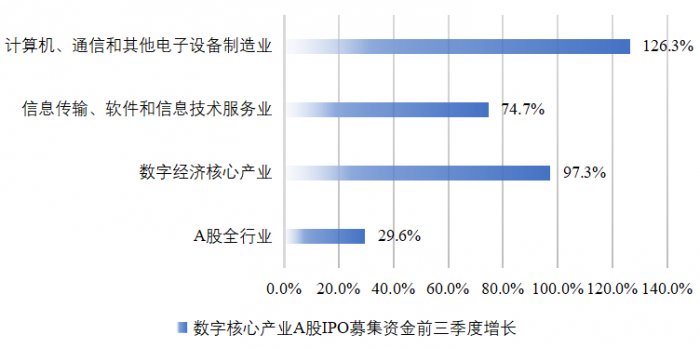 四是数字经济核心产业企业IPO数量及募资规模快速增长。随着数字经济蓬勃发展,新企业较快涌现,一些企业快速成长并受到资本市场青睐。今年前三季度,数字经济核心产业A股新上市公司99家,占全部A股新上市公司数量的近三分之一,通过IPO募集资金2109.5亿元,占全部A股IPO募集资金的43.4%;IPO募集资金数量较去年同期增长97.3%,而同期全部A股IPO募集资金增幅仅为29.6%。
