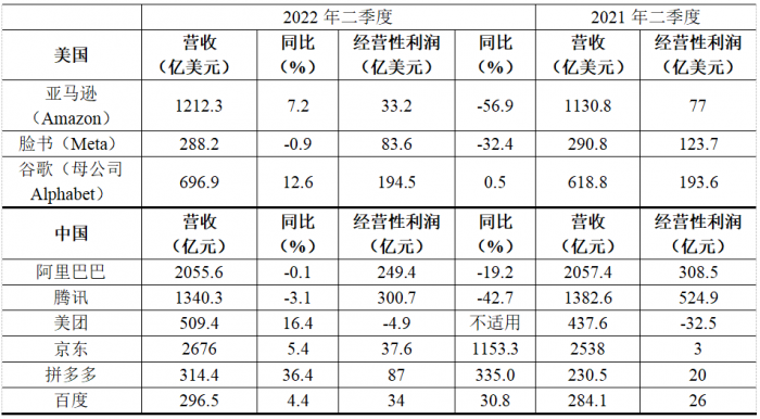 从国内对比看,头部数字经济平台企业营收和利润增长出现分化趋势。今年二季度,阿里巴巴和腾讯营收同比分别出现0.1%和3.1%的下滑,经营性利润同比分别出现19.2%和42.7%的下跌,员工规模也有所收缩。与此相反的是,京东、拼多多和百度营收和利润保持增长,美团营收增长、亏损收窄。