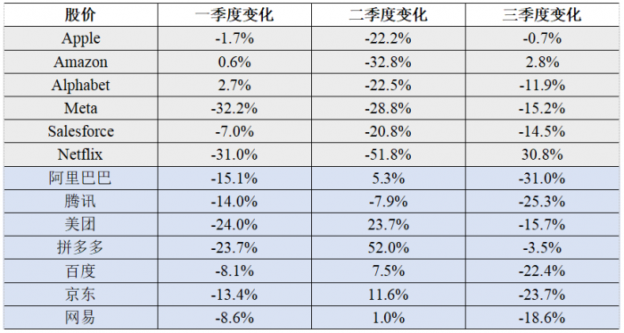 表2:中美数字经济领军企业今年各季度股价变化比较