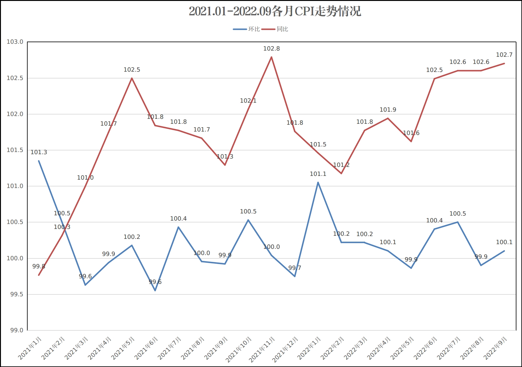 受2021年同期对比基数较低影响,1月份CPI同比上涨1.5%,2月份同比涨幅收窄至1.2%,3-4月份受疫情及能源价格上涨影响,同比涨幅扩大至1.8%、1.9%,5月份同比涨幅回落至1.6%,6月份在食品和能源价格上涨的带动下,同比涨幅扩大至2.5%,7-9月份在食品价格持续高企的影响下,同比涨幅扩大至2.6%、2.6%、2.7%。