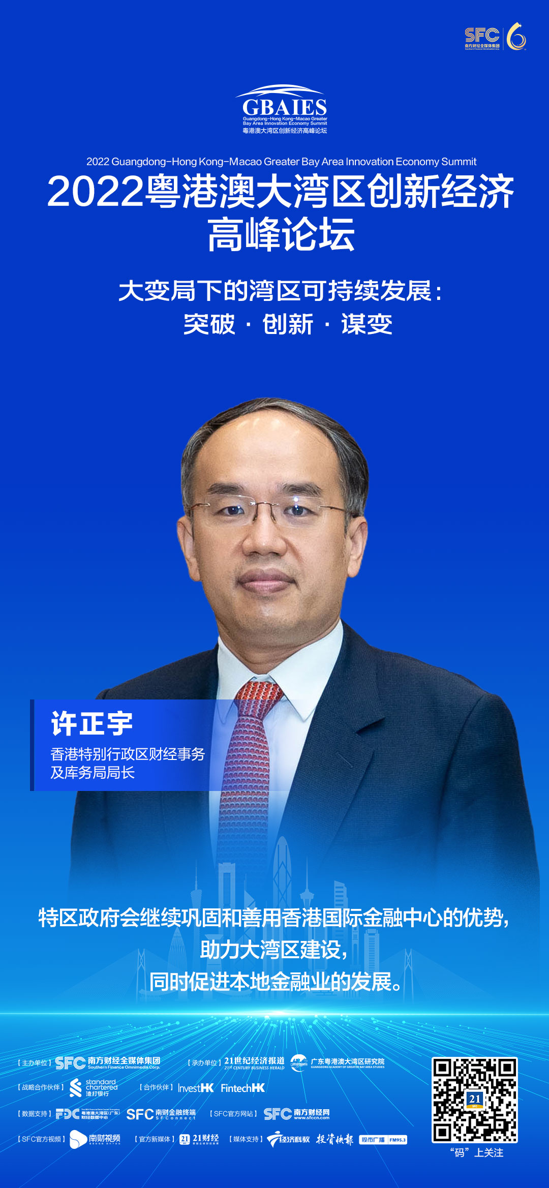 香港特别行政区财经事务及库务局局长许正宇在论坛上致辞时表示,“特区政府会继续巩固和善用香港国际金融中心的优势,助力大湾区建设,同时促进本地金融业的发展。”