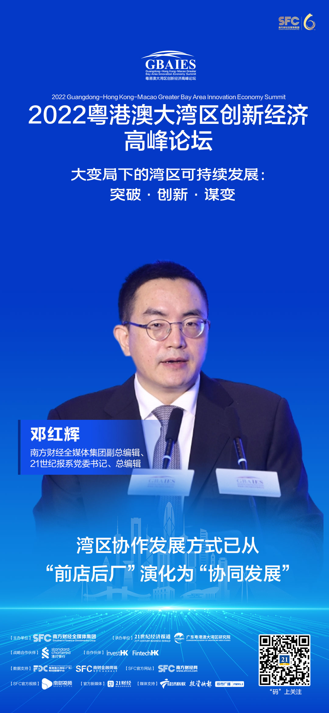 在本次论坛上,南方财经全媒体集团副总编辑,21世纪报系党委书记、总编辑邓红辉表示,2022粤港澳大湾区创新经济高峰论坛以“大变局下的大湾区可持续发展:突破·创新·谋变”为主题,盛邀来自政府部门、学术界、金融界、产业界等领域的重磅嘉宾,以及全球关注大湾区发展的有识之士,就大湾区建设特别是创新经济发展的重大议题献计献策。