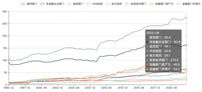 宏观杠杆率是衡量是否“过度举债”的重要指标,郭树清表示,要管好货币总闸门,防止宏观杠杆率持续快速攀升。国家金融与发展实验室网站显示,截至2022年9月末,我国非金融企业部门、居民部门、政府部门杠杆率分别为161.8%、62.4%、49.7%,今年以来均有所提升。