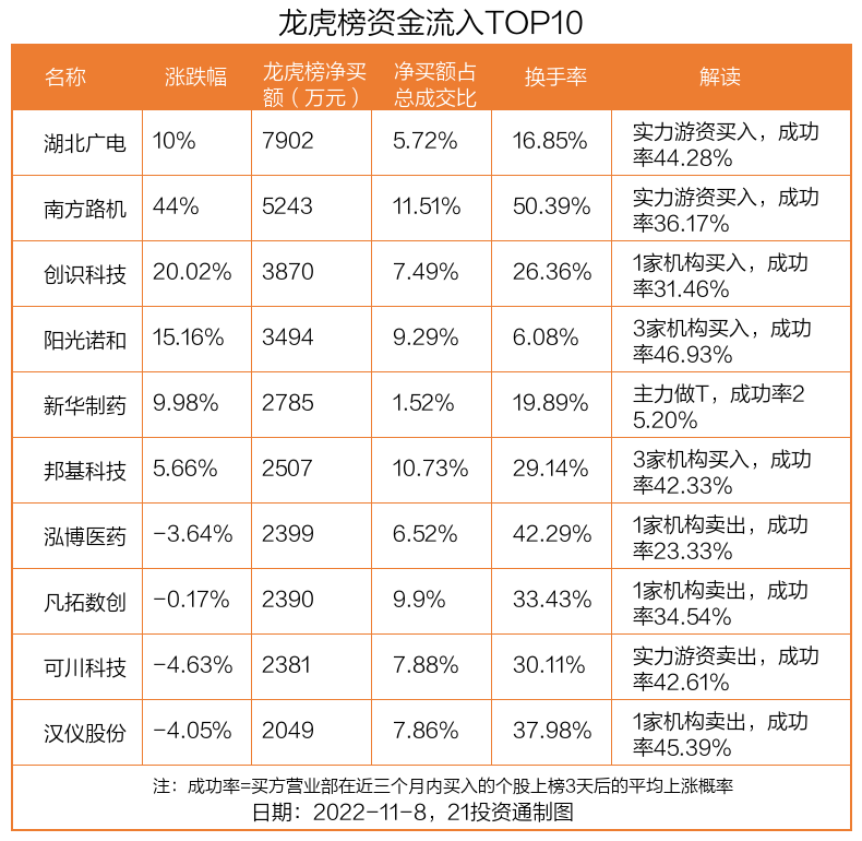 11月8日,上证指数下跌0.43%,深证成指下跌0.58%,创业板指下跌0.91%。盘后龙虎榜数据显示,共有35只个股因当日异动登上龙虎榜,资金净流入最多的是湖北广电(000665.SZ),达0.79亿元。