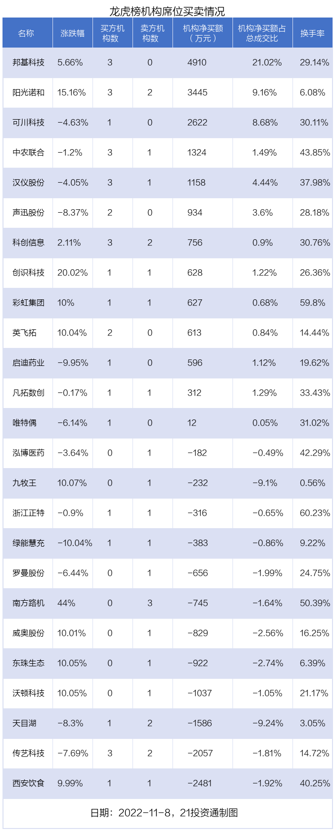 11月8日,25只个股龙虎榜出现了机构的身影,机构合计净买入6510.44万元。具体来看,机构净买入13股,净卖出12股。