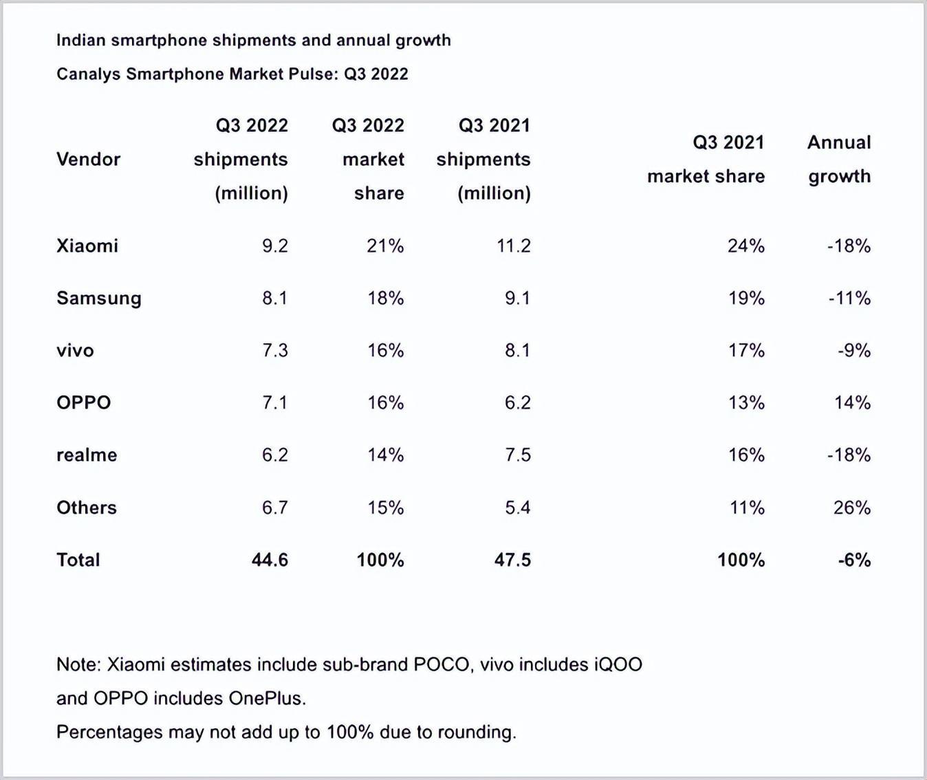 ▲2022年第三季度印度手机市场格局,来源:canalys