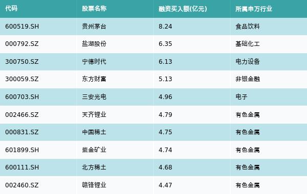 11月7日,两市共有3069只个股有融资资金买入,其中贵州茅台、盐湖股份、宁德时代排名前三,买入金额分别8.24亿元、6.35亿元、6.13亿元。融资买入额前10个股详情见下表: