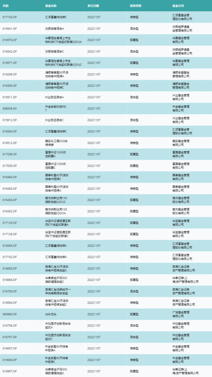 11月7日,有32只新基金发行,分别为:汇添富鑫悦纯债C、交银启衡混合A、华夏恒生香港上市生物科技ETF发起式联接(QDII)A、交银启衡混合C、华夏恒生香港上市生物科技ETF发起式联接(QDII)C、浦银季季盈90天滚动持有中短债A、浦银季季盈90天滚动持有中短债C、兴业致远混合A、中金安徽交控REIT、兴业致远混合C、汇添富鑫润纯债C、嘉实长三角ESG纯债债券、富国中证1000优选股票A、富国中证1000优选股票C、国泰利盈60天滚动持有中短债C、国泰利盈60天滚动持有中短债A、南方纳斯达克100指数发起(QDII)C、南方纳斯达克100指数发起(QDII)A、华宝中证港股通互联网ETF发起式联接A、华宝中证港股通互联网ETF发起式联接C、汇添富鑫润纯债A、汇添富鑫悦纯债A、渤海汇金30天滚动持有中短债发起A、华泰紫金沪深300指数增强发起C、渤海汇金低碳经济一年持有期混合发起、渤海汇金30天滚动持有中短债发起C、光伏龙头、中加医疗创新混合发起式A、中加医疗创新混合发起式C、中金安盈90天持有中短债A、中金安盈90天持有中短债C、华泰紫金沪深300指数增强发起A,详情见下表: