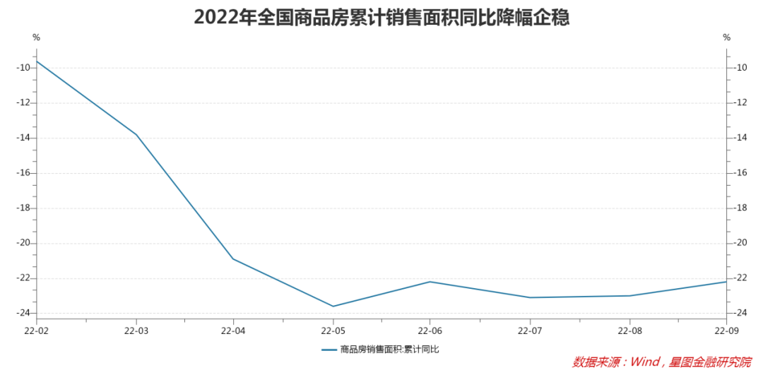 自2021年末开始,政策端便一直在持续发力,但就地产刺激政策来看,市场的普遍看法是“托而不举”:一方面坚持高质量发展原则,不把地产作为短期刺激经济的手段,房住不炒仍为政策红线;另一方面关注房企违约和房价下跌的衍生风险,注重稳房价、稳预期,着力保交楼、保民生,持续调整政策支持刚性和改善性住房需求。在政策支持下,截至9月末,全国商品房累计销售面积同比降幅已经企稳,且有小幅收窄趋势。