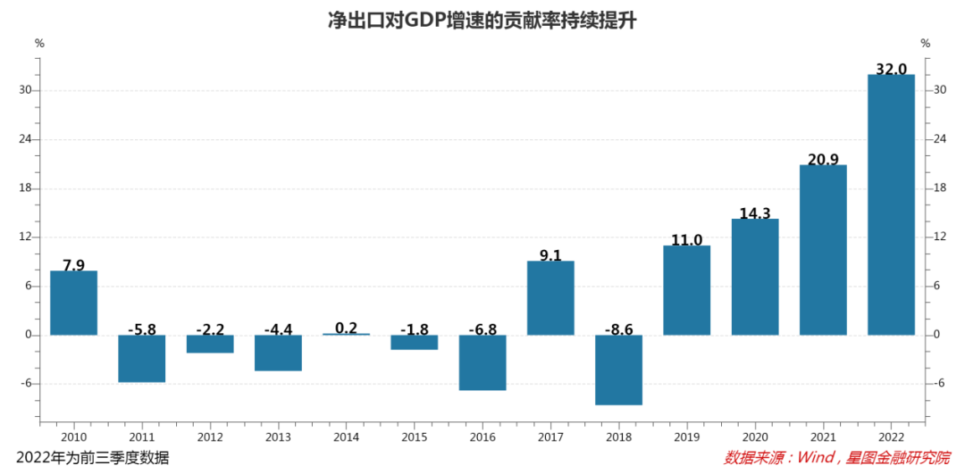 2020年以来,净出口对我国GDP的贡献率逐年提升,2022年前三季度已提升至32%。净出口的快速上升在相当程度上弥补了内需的疲弱,确保了经济增速保持在合理水平,也给疫情防控和房住不炒等政策执行提供了空间。