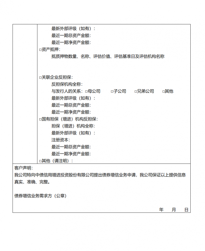 根据21世纪经济报道记者从官网所获得的《项目需求意向表》,其中除了基本信息以外,主要还包括境内境外债券信用情况,即是否违约等;以及拟提供的风险缓释方式,包括金融机构风险缓释国企反担保、资产抵押、关联企业反担保以及国有担保(增进)机构反担保的方式。
