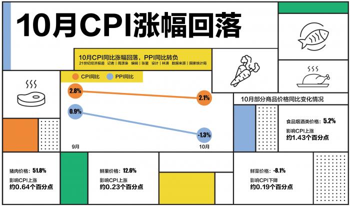 10月全国居民消费价格(CPI)同比上涨2.1%,较上月回落0.7个百分点。10月猪肉价格涨幅有所扩大,但鲜菜、鲜果、水产品等大量上市,加上消费需求有所回落,食品类价格带动作用不及预期。