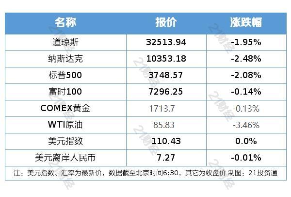 纽约股市三大股指9日显著下跌。截至当天收盘,道琼斯工业平均指数比前一交易日下跌646.89点,收于32513.94点,跌幅为1.95%;标准普尔500种股票指数下跌79.54点,收于3748.57点,跌幅为2.08%;纳斯达克综合指数下跌263.03点,收于10353.17点,跌幅为2.48%。