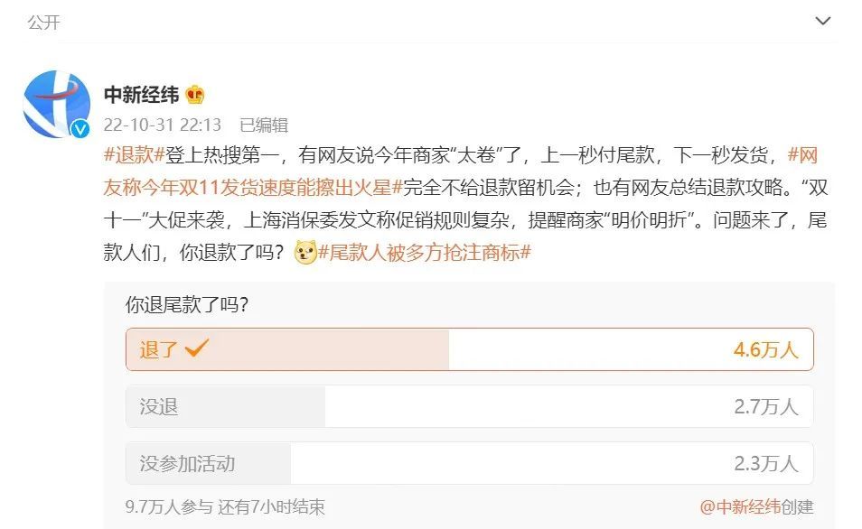中新经纬的一项双11退尾款调查中,多数人选择了退款。(图源:微博)