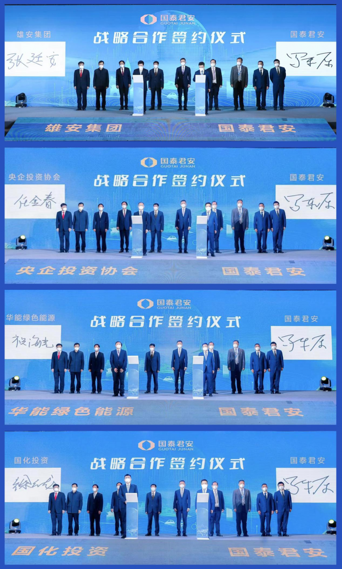 论坛现场,在贺青、刘中林、于国义,北京央企投资协会副会长、中国化学工程集团投资事业部总经理、国化投资控股董事长王利生,中国华能集团财务资产部副主任陈学国等的共同见证下,国泰君安证券先后与雄安集团、央企投资协会、华能雄安绿色能源有限公司、国化投资控股有限公司签署战略合作协议,共同携手服务雄安新区建设、助推京津冀协同发展。