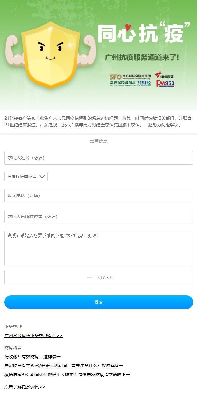 21财经客户端实时收集广大市民因疫情遇到的紧急迫切问题,将第一时间反馈给相关部门,并联合21世纪经济报道、广东经视、股市广播等南方财经全媒体集团旗下媒体,一起助力问题解决!