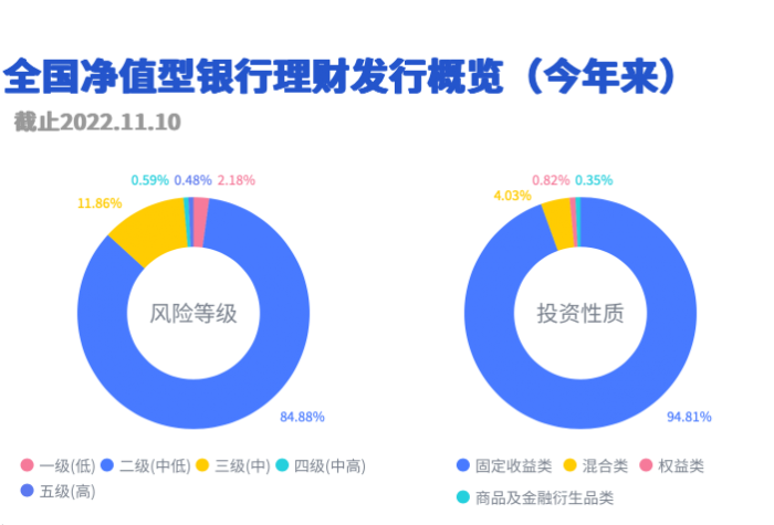 南财金融终端、南财理财通数据显示,截至2022年11月10日,今年以来全国发行净值型银行理财产品23,396只。其中,一级(低风险)产品占比2.2%,二级(中低风险)产品占比85.34%,三级(中风险)产品占比11.92%,四级(中高风险)产品占比0.6%,五级(高风险)产品占比0.49%。