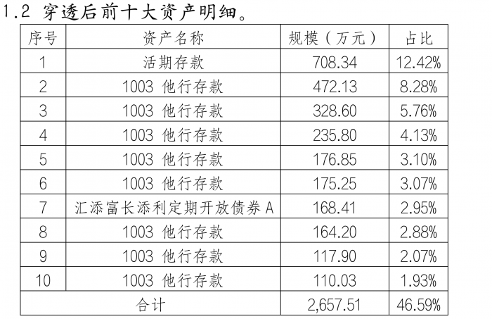 根据穿透后前十大资产明细显示,存款规模为2489.1万元,占比43.64%。